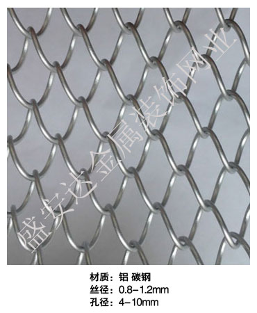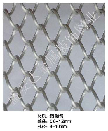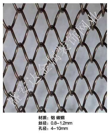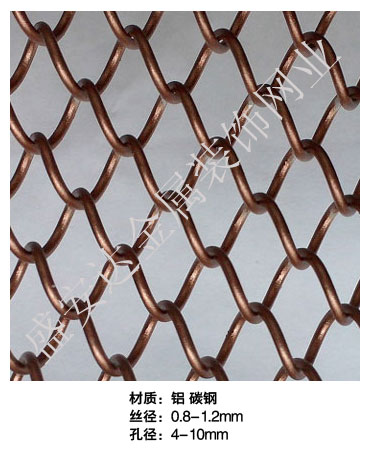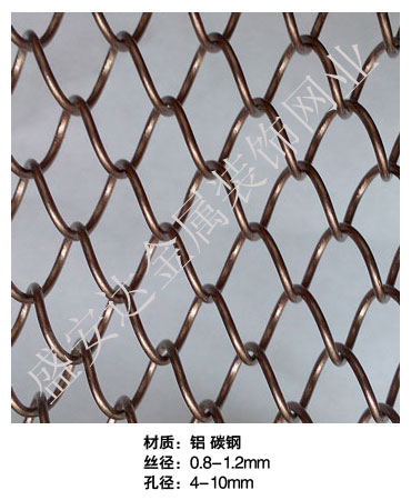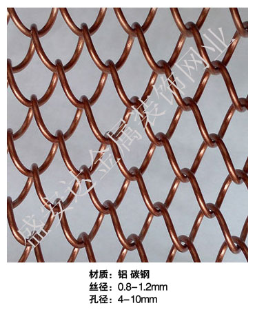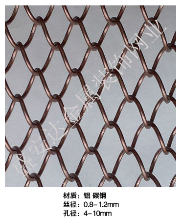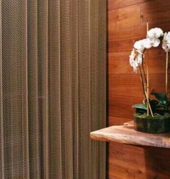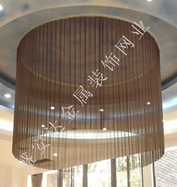 金屬網(wǎng)簾----是一種新型建筑裝飾材料,采用優(yōu)質(zhì)不銹鋼,鋁合金等合金材料,經(jīng)過特殊工藝編制而成,被賦予了傳統(tǒng)布簾所不具有的的折光效果,讓它具有了動感時尚的特點(diǎn),再加上它的金屬質(zhì)感的特點(diǎn),給您的居室頓感典雅氣質(zhì)非凡個性高貴品位,會使高檔賓館,餐廳,歌劇院,展廳變的富麗堂皇。