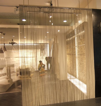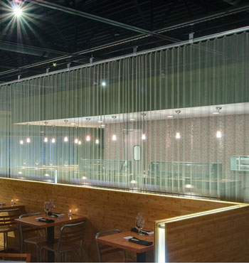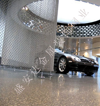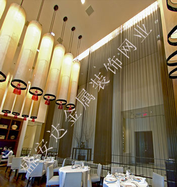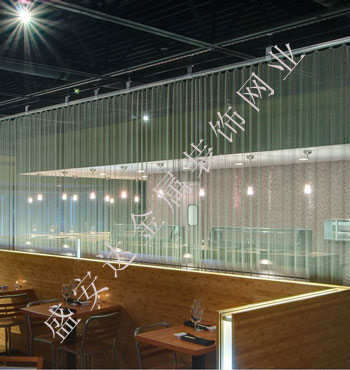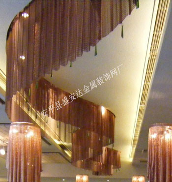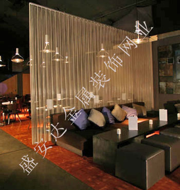金屬網(wǎng)簾可被應(yīng)用于大尺寸的割斷或正面裝飾,亦可小面積的局部裝點(diǎn)。其天然金屬色澤隨著光線的不同變化余燈光產(chǎn)生的反射作用,透過金屬網(wǎng),形成一個隔而不斷的整體空間,給人以視覺上的開闊感,想象空間無限。